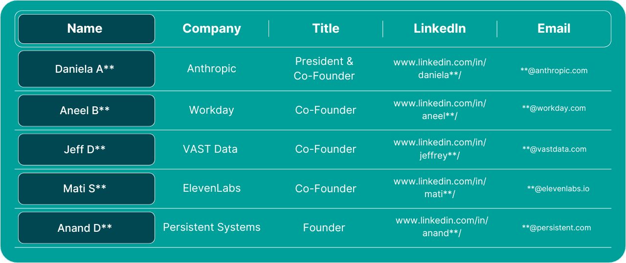 Access verified Dreamforce 2025 attendee contacts from founders at leading startups like Anthropic, Workday, and VAST Data. Download the full Founder Attendee List today.