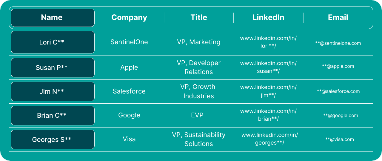Access +1,250 verified Dreamforce 2025 attendee contacts from VPs and senior executives at top companies like Salesforce, Google, and Apple. Download the full VP Attendee List today.