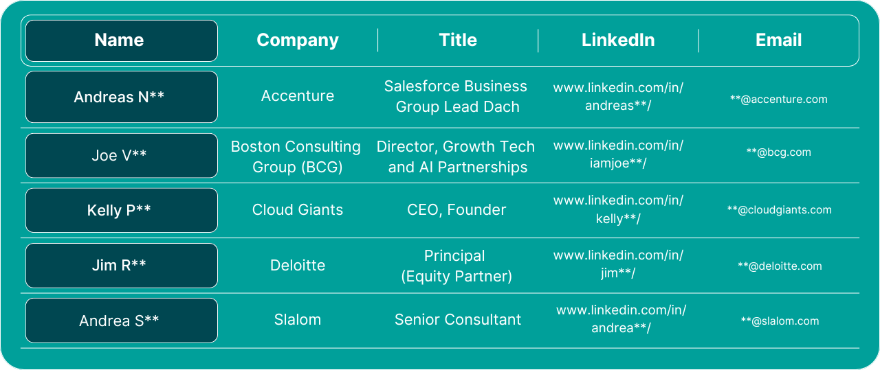 Access verified Dreamforce 2025 attendee contacts from consulting leaders driving digital transformation in strategy, operations, and technology.
