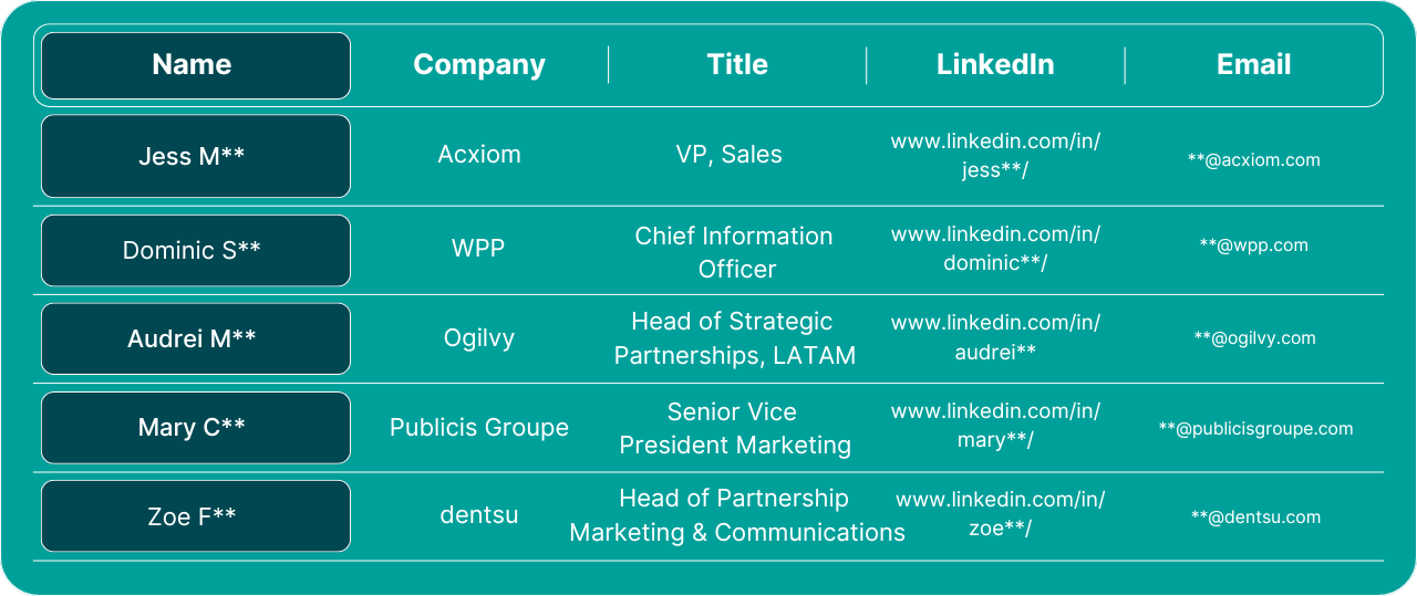 Access verified Dreamforce 2025 attendee contacts from marketing and advertising leaders across agencies, brand teams, and martech platforms.